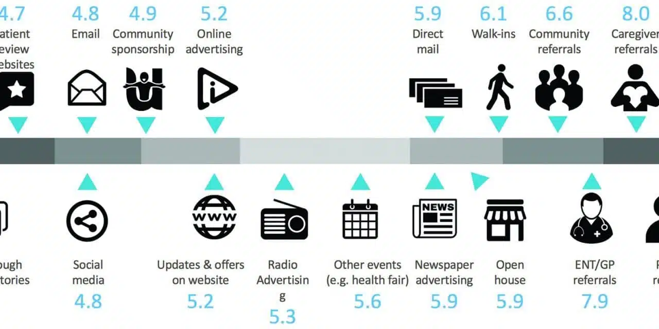The majority of clinics acknowledge that retaining and growing business through their existing patient base is more effective than marketing to new prospects. (The referral base goes beyond patients to include ENTs and caregivers.) Two of every three new patients come from referrals rather than from marketing to new patients (Figure 1).