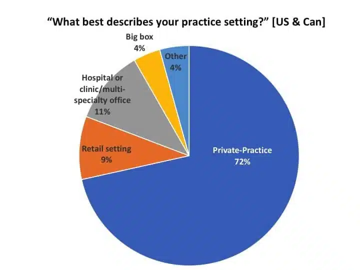 Editor’s note: Because the Covid-19 pandemic appears to have hit private practice and retail (PP&R) offices disproportionately hard—and these offices constitute 81% of this survey’s respondents (and HR’s core readership)—I will focus primarily on this segment. In almost all cases, except where noted, the statistics for the total dispensing professionals (ie, including hospitals/clinics, big box, etc) were generally within 5% of those of PP&R offices. Readers interested in the “all dispenser” figures may contact the editor for more detailed data.