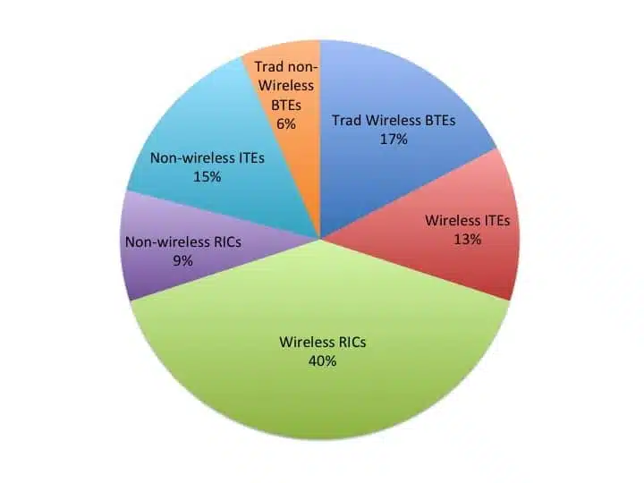 The figure shown here provides information on the usage of wireless versus non-wireless hearing aids in the first quarter of 2013 separated into three styles: in-the-ear (ITE), traditional behind-the-ear (BTE Trad), and receiver-in-the-canal or receiver-in-the-ear (RIC) device catagories. RIC/RITEs now constitute half (49%) of all hearing aid sales, and four-fifths (82%) of all RIC/RITEs use wireless technology. Traditional BTEs and ITEs essentially split the remaining half of the market into their respective quarters. The majority (73%) of traditional BTEs are wireless, while just less than half (46%) of ITEs are wireless.