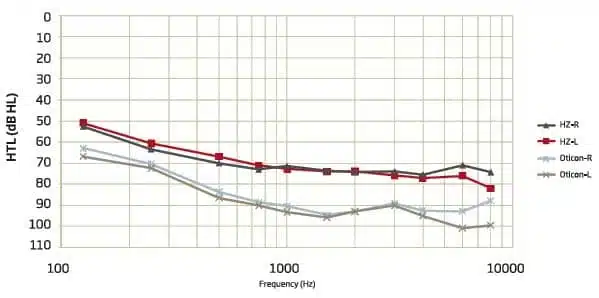 Figure 1. Hearing threshold levels (HTL) from the two test sites at Hörzentrum, Oldenburg (HZ), and Oticon, Smørum, Denmark.