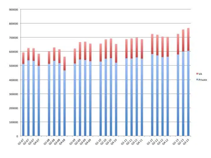 VA dispensing in Q3 2013. The VA constituted 21.1% of all units dispensed during Q3 2013, compared to 20.1% for the same period last year. Its 11.2% third-quarter growth figure was the largest for the VA since the second quarter of 2010.