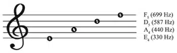 FIGURE 1. Several notes shown on a treble clef along with their frequencies. (Figures in this article from Musicians and the Prevention of Hearing Loss, 1st edition by Chasin, 1996. Reprinted with permission of Delmar Learning, a division of Thomson Learning.)