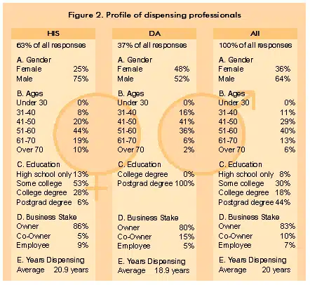 About half (47%) of all dispensing professionals are paid via a fixed salary (HIS 41%, DA 55%), and 38% are paid using some kind of salary-plus-commission arrangement (HIS 39%, DA 36%). Commission-only salaries were used in 13% of the offices/practices (HIS 16%, DA 9%), while a commission-plus-expenses system was use in only 3% of offices (HIS 5%, DA 0%).