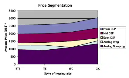 Figure 1. Average price of hearing aids in late 2003 by technology type and style of hearing aid (BTE, ITE, canal, and CIC). Average prices offered by all dispensing professionals for analog non-programmable aids ranged from $916-$1339, analog programmable from $1157-$1603, and digital from $1302-$3040, with ITEs and BTEs generally being the least expensive, and ITCs and CICs commanding greater prices due to the fitting/servicing issues surrounding them. Although price segmentation between the premium, mid and economy level DSP categories are probably not as clear-cut as shown here, its likely that dispensing professionals have benefitted from a distinct good (eg, analog non-programmable aids), better (programmable analog), and best (digital) system of technology offerings. One can also see in this graph how the programmable analog segment is getting squeezed severely by the analog and DSP segments. *Note: Prices include, for the most part, audiological testing, fitting, and service fees.