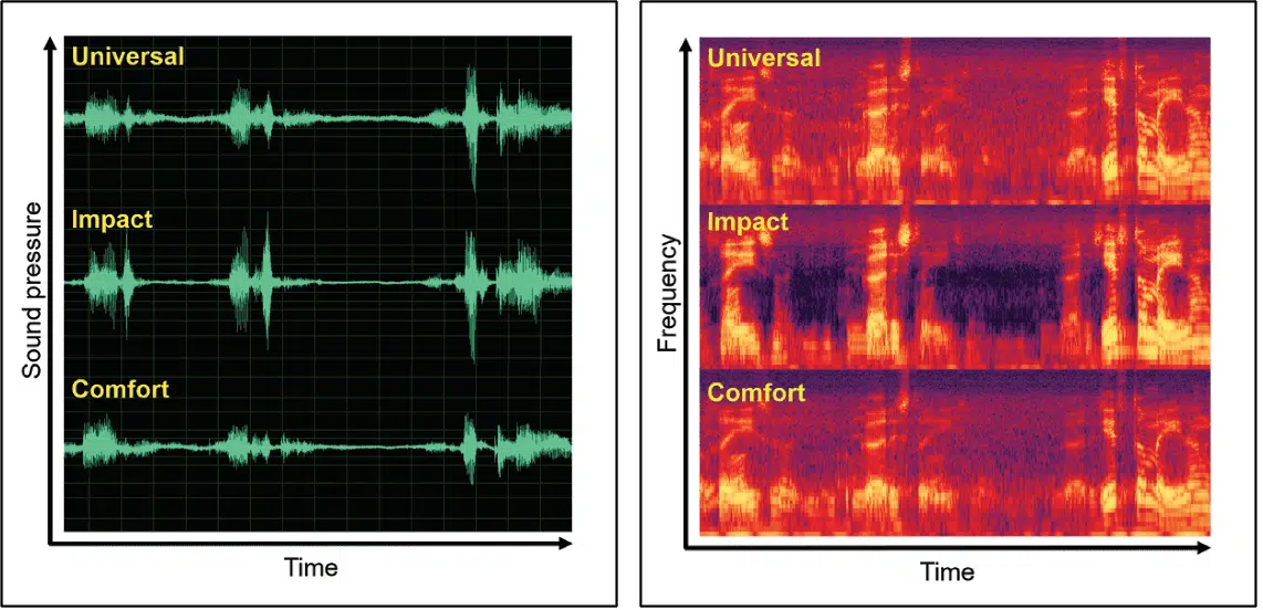 The Impact program in Widex EVOKE was designed to provide more speech cues to the wearer—and thereby improve speech intelligibility—in situations where some speech cues may be audible but where the wearer still struggles to understand everything. In brief terms, this has been obtained by optimizing the setting of the Speech Enhancer (Kuk and Paludan-Müller, 2006), by making the fast part of the Variable Speed Compressor (Kuk et al, 2018) more expansive, and by providing more gain at high frequencies, compared to the Universal program. As seen in the waveforms and spectrograms of a processed speech signal, which are presented in Figure 1, the effect of the Impact program is a reinforcement of the temporal and spectral contrasts in the speech signal, as compared to the processing performed by the Universal program. Thus, the peaks in the speech signal are amplified more, and the soft parts (and pauses) in the speech receives less amplification with the Impact program. The result is a more distinct sound of the speech, especially the high-frequency consonants, which in some situations will make the speech easier to understand. However, these processing changes are not without consequences. The sound of the speech may be perceived as sharper and less natural than the Universal processing, and this explains why the Impact processing is implemented as an additional program and not as part of the Universal program. Some wearers may like the sound—or be indifferent to the sound quality when they are offered an improved ability to understand speech—while others may be more reluctant to accept it.