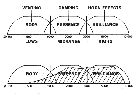 | FIGURE 8. The general effects of venting, damping, and acoustic horns on the frequency of a hearing aid. Note on the bottom schematic a typical frequency response is superimposed on the figure. Adapted from Berger, 1970.7 |
