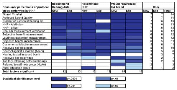 | TABLE 3B. The impact of the hearing care process on three measures of success: Would the new and experienced user 1) Recommend hearing aids; 2) Recommend the hearing healthcare practitioner, and 3) Recommend the same brand of hearing aid? The four shades of blue represent levels of statistical significance, with darker shades corresponding to higher significance levels. |