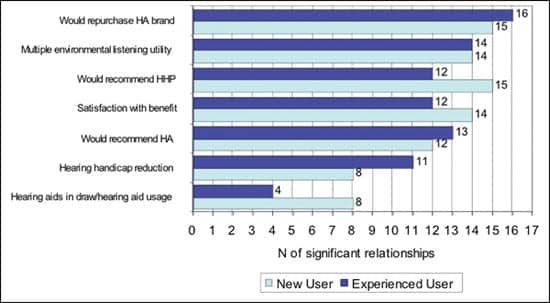 With respect to outcomes (Table 2 and Figure 2), nearly 13% of new users have their hearing aids in the drawer compared to 3.5% of experienced users; 1 in 4 new users use their hearing aids less than 2 hours a day. Experts generally agree that hearing aid users who wear their hearing aids at least 4 hours a day are considered potentially successful users. About 7 out of 10 new users wear their hearing aids 4 or more hours a day compared to nearly 9 of 10 experienced users.