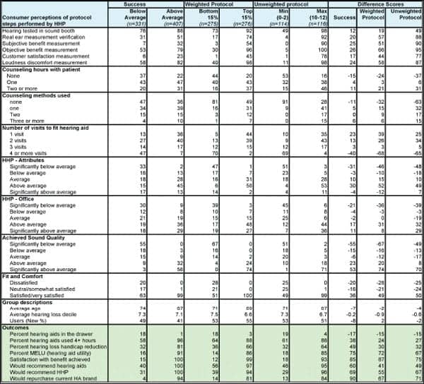 In Table 4, three high-low comparisons are documented: above- and below-average hearing aid success, top- and bottom-weighted protocols, and a minimum (min) and comprehensive (max) protocol. In the final three columns of this table are the difference scores between the high and low groups. Group descriptions are provided. At the bottom—shaded in green—are the individual outcome measures. Each of the high-low analyses will be discussed in sequence.
