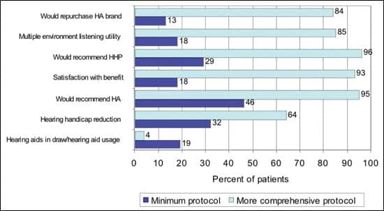 | FIGURE 7B. Impact of a protocol on hearing aid success comparing a minimum protocol (0-2 items) to a more comprehensive protocol (10-12 items). |