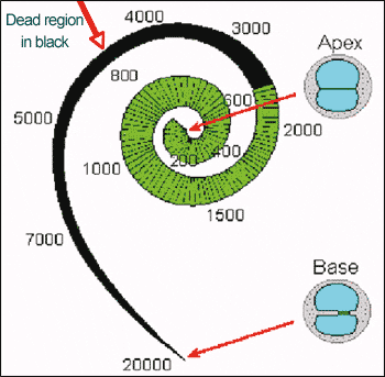 A dead region can be characterized in terms of the range of CFs that would normally be associated with that region. In other words, a frequency-to-place map is used to relate the cochlear location at each edge of the dead region to frequency (Figure 2). For example, suppose that the IHCs are nonfunctioning over a region of the basilar membrane having CFs in the range 2500 to 20,000 Hz. One might describe this as a dead region extending from 2500 Hz upwards. The lower edge frequency (expressed in kHz) of the dead region example is 2500 Hz or 2.5 kHz.